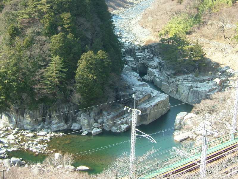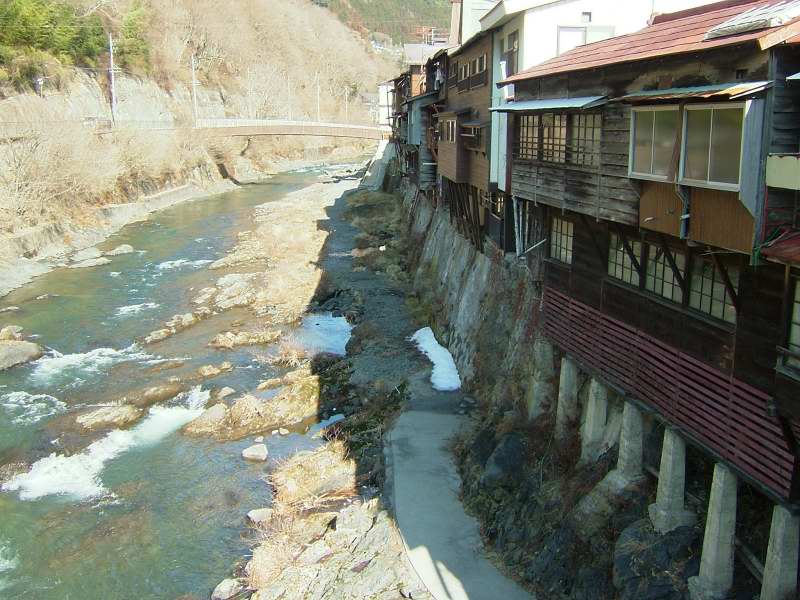 崖屋造りと木曽川 福島宿は土地が狭いため、このような家が見られる。 |