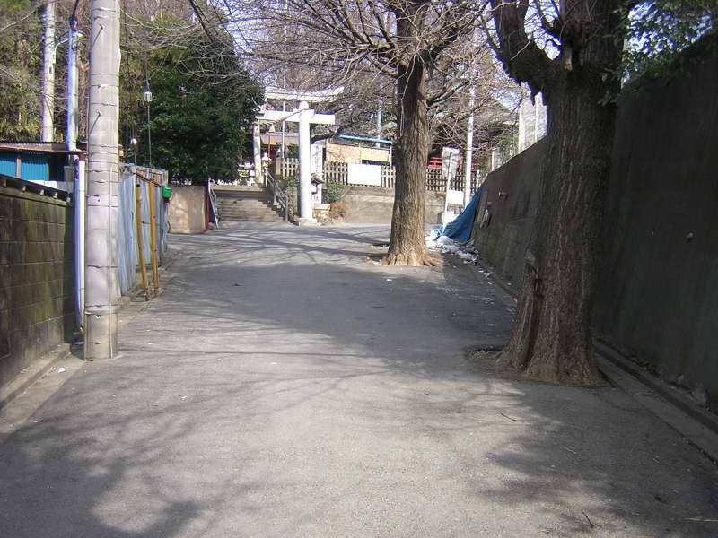 | 貝殻坂 (左の坂の上に鎌倉街道通る) | 道は高い位置(大門坂下公園より) | 貝殻坂から大門神社に向かう街道 | 街道は高台なので眺めが良い | |||