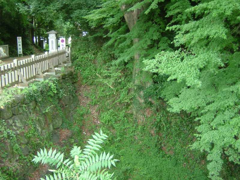 西曲輪から中曲輪に向けての堀と土塀の様子。堀は、かなり深くなっている。 土塀は、高さ82間、濠幅10間。 |